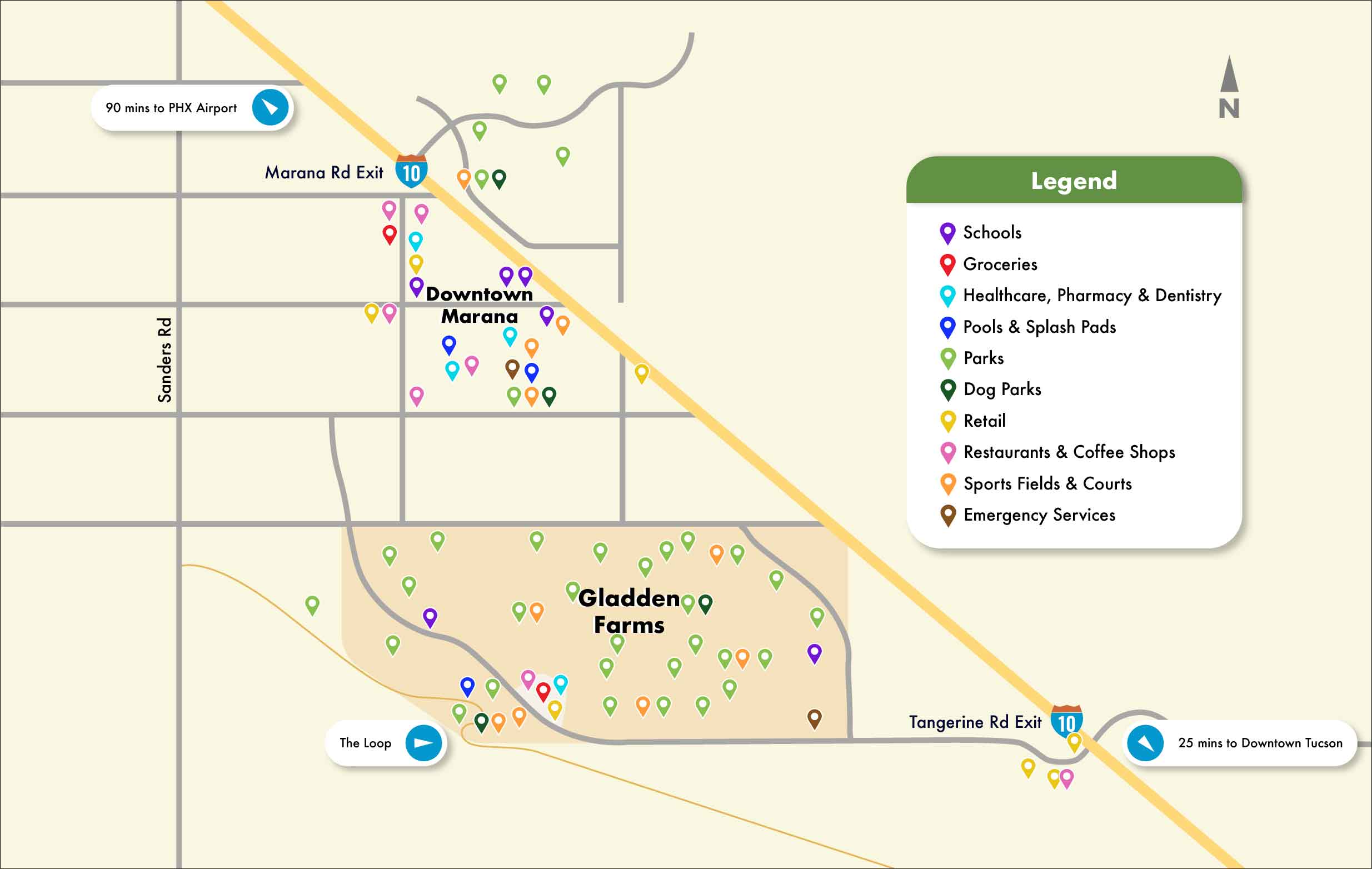 - Government & community services: Marana City Hall, Police Department, Post Office, Senior Center, Food Bank and Community Resource Center
